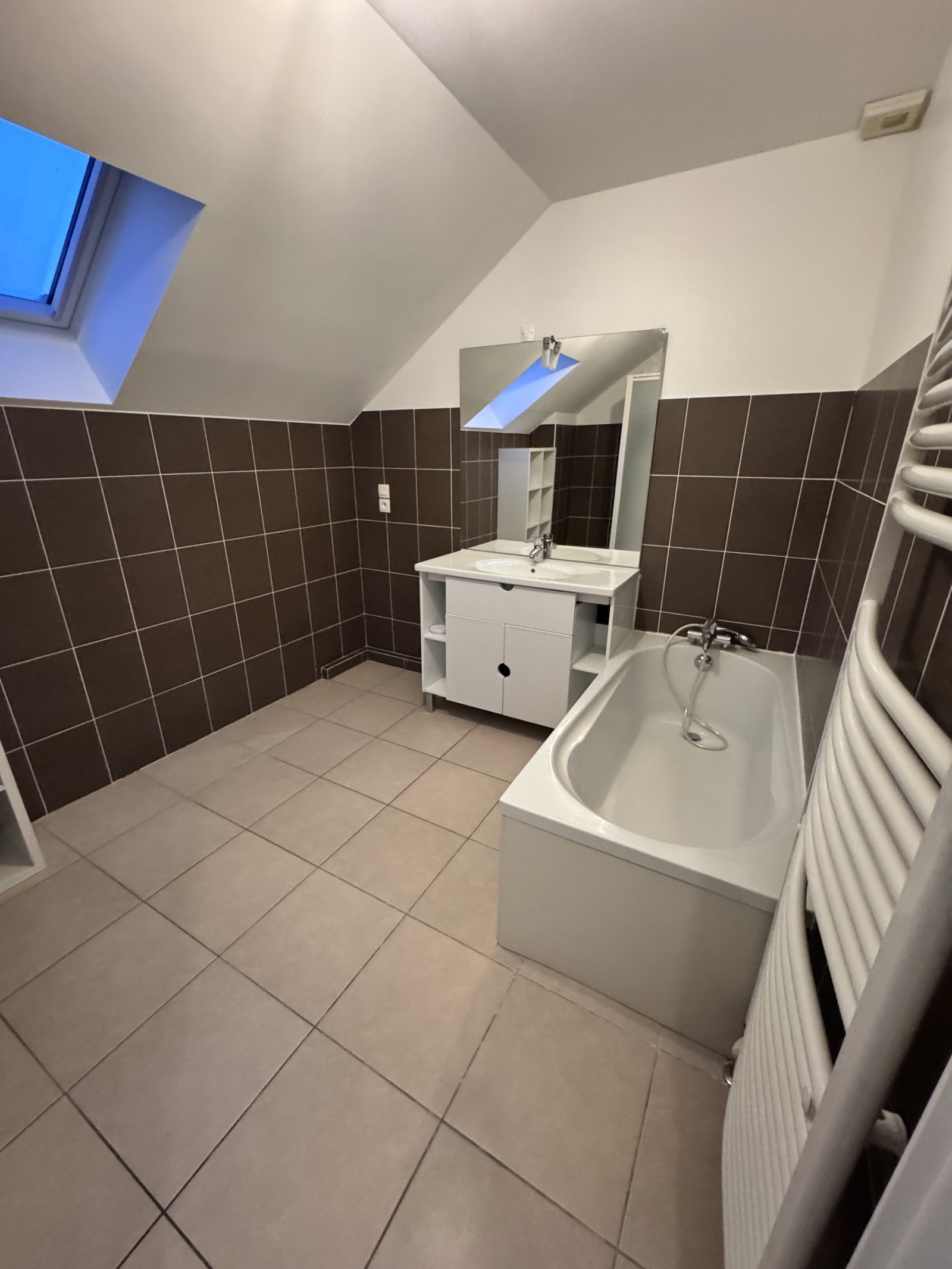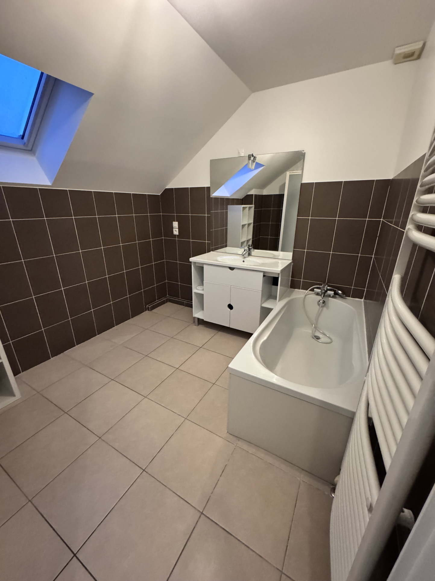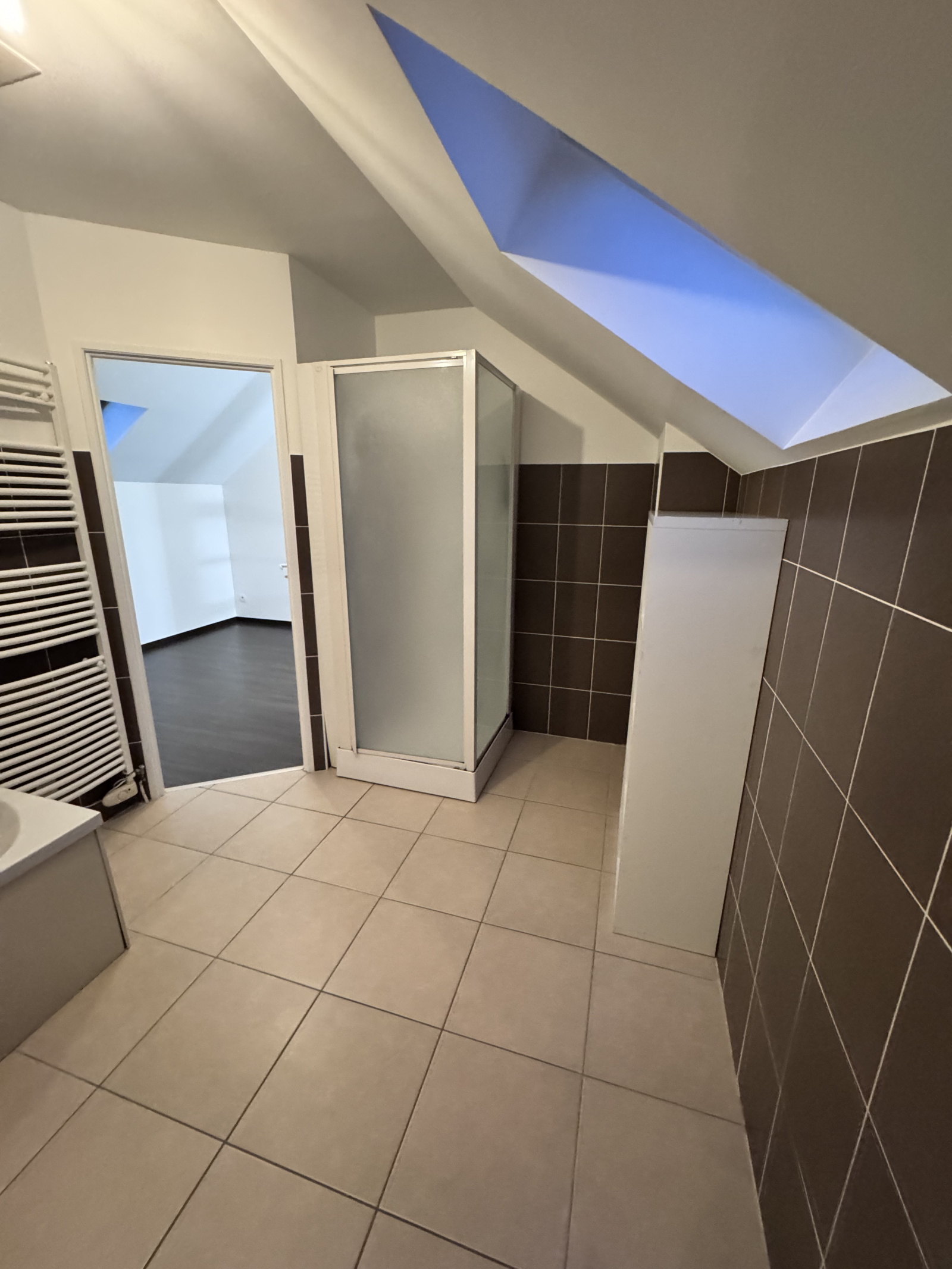 -Une salle de bains avec douche et baignoire avec radiateur porte serviette.