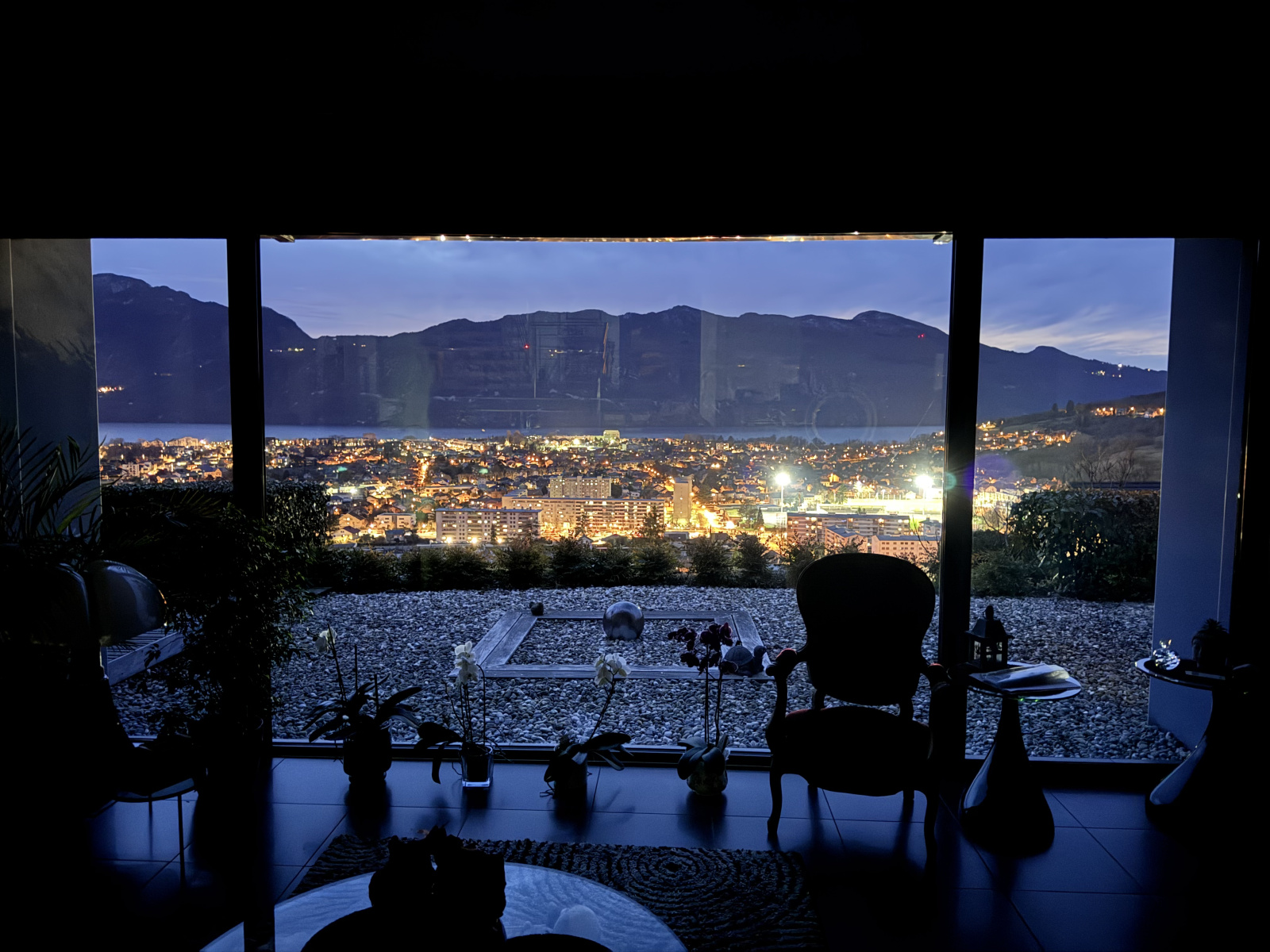 Située première hauteur d'Aix les Bains en position dominante, au cœur d’un environnement résidentiel discret et très prisé, cette propriété contemporaine développe environ 295m² au sol et offre une vue panoramique exceptionnelle sur le lac du Bourget et les reliefs alpins.