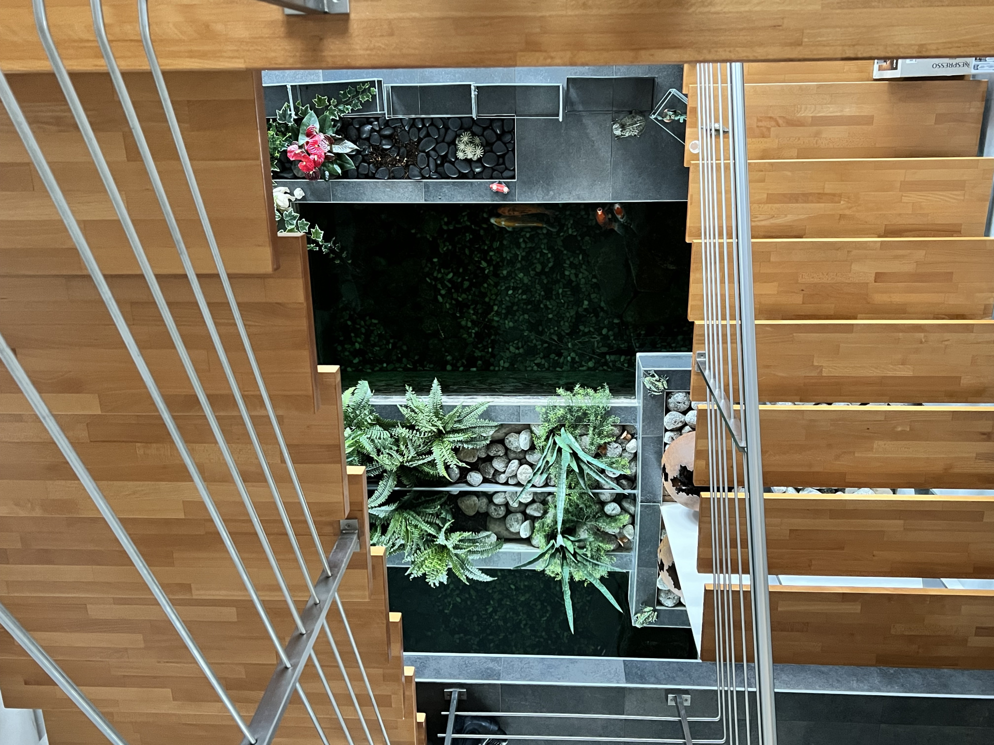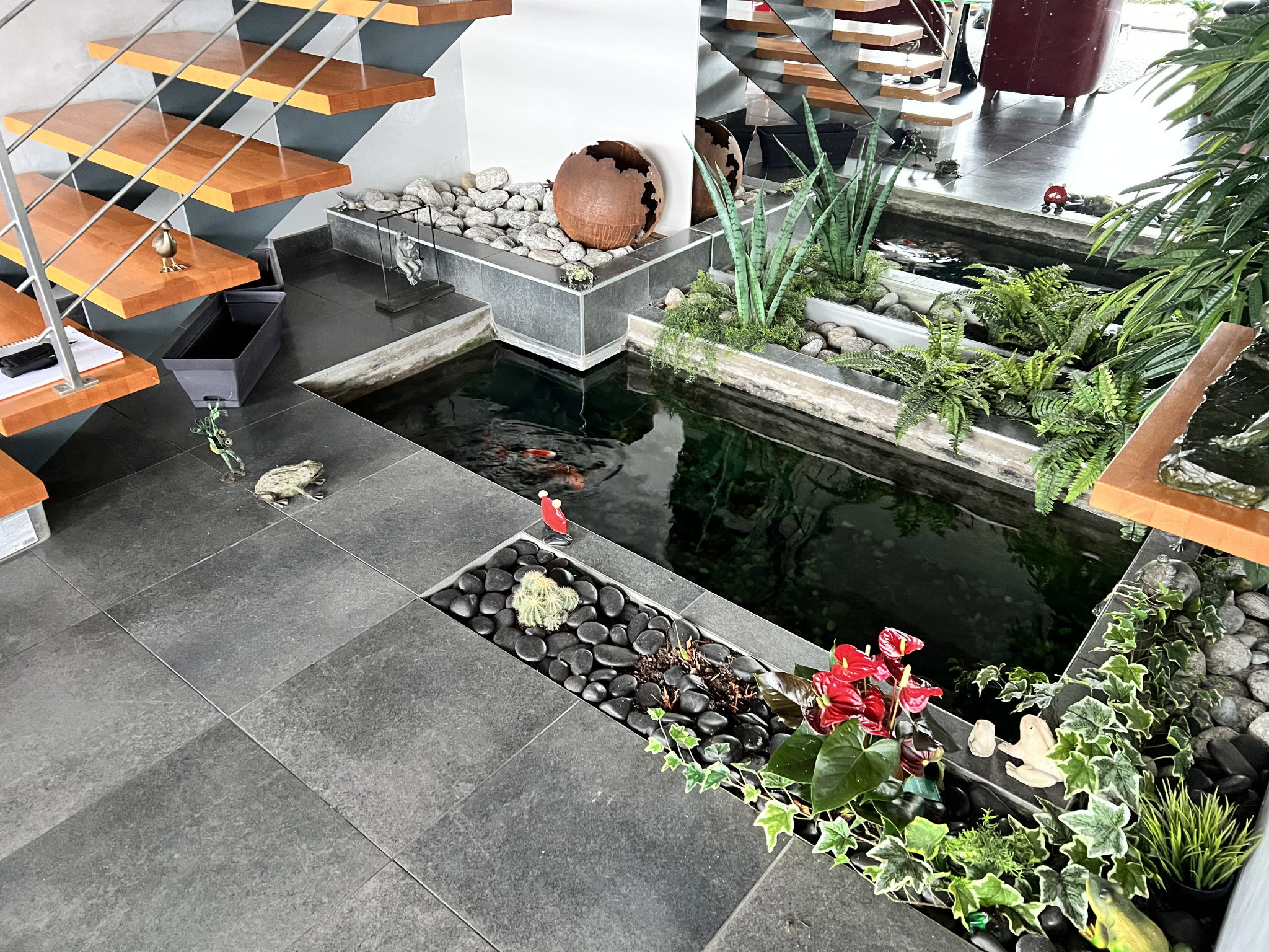 Un élément unique distingue cette propriété : sous l’escalier, un bassin de carpes Koï japonaises, véritable pièce d’eau intérieure, crée une atmosphère zen et raffiné, apportant une touche d’art de vivre japonaise et de sérénité à l’espace de réception.