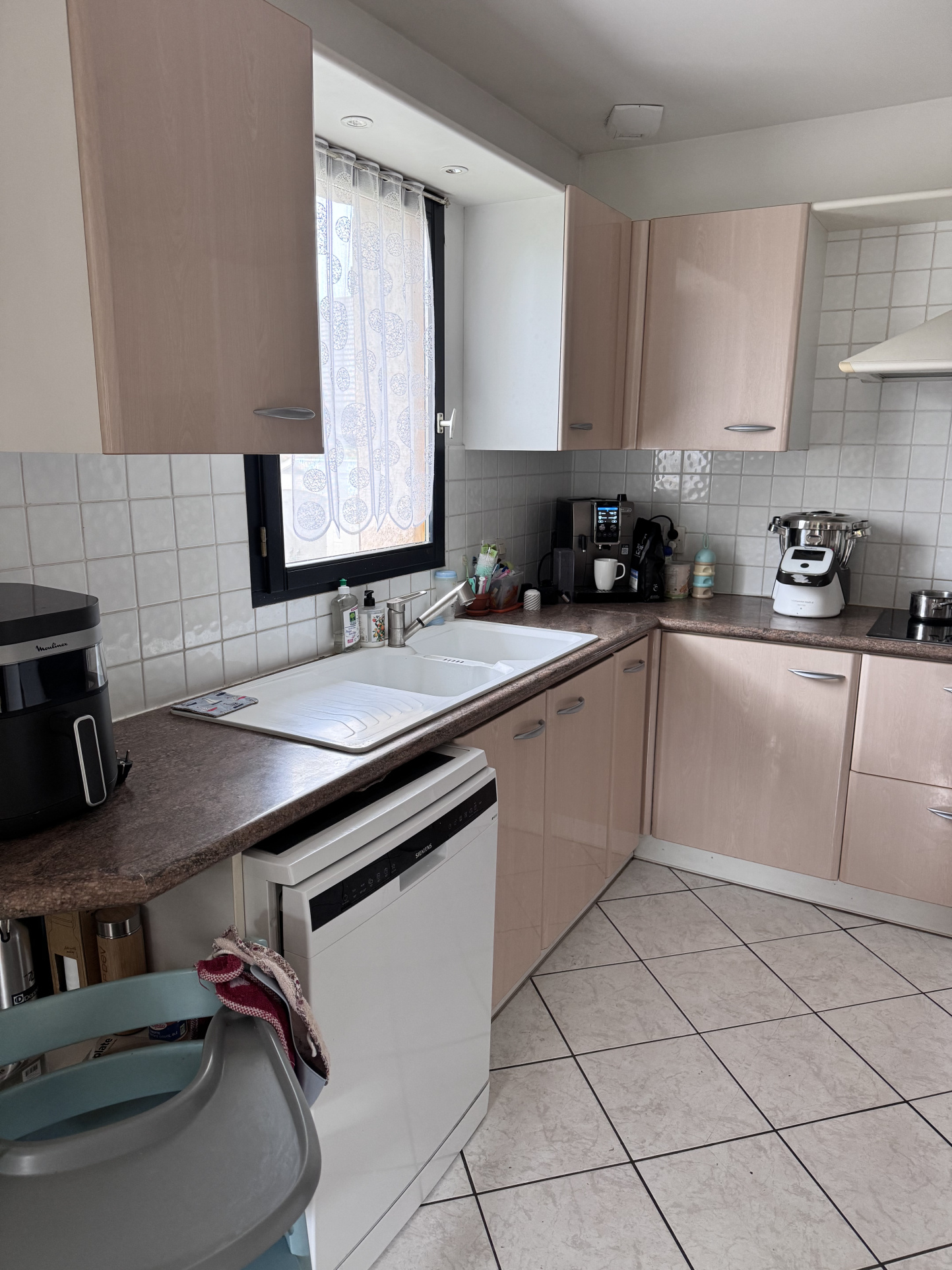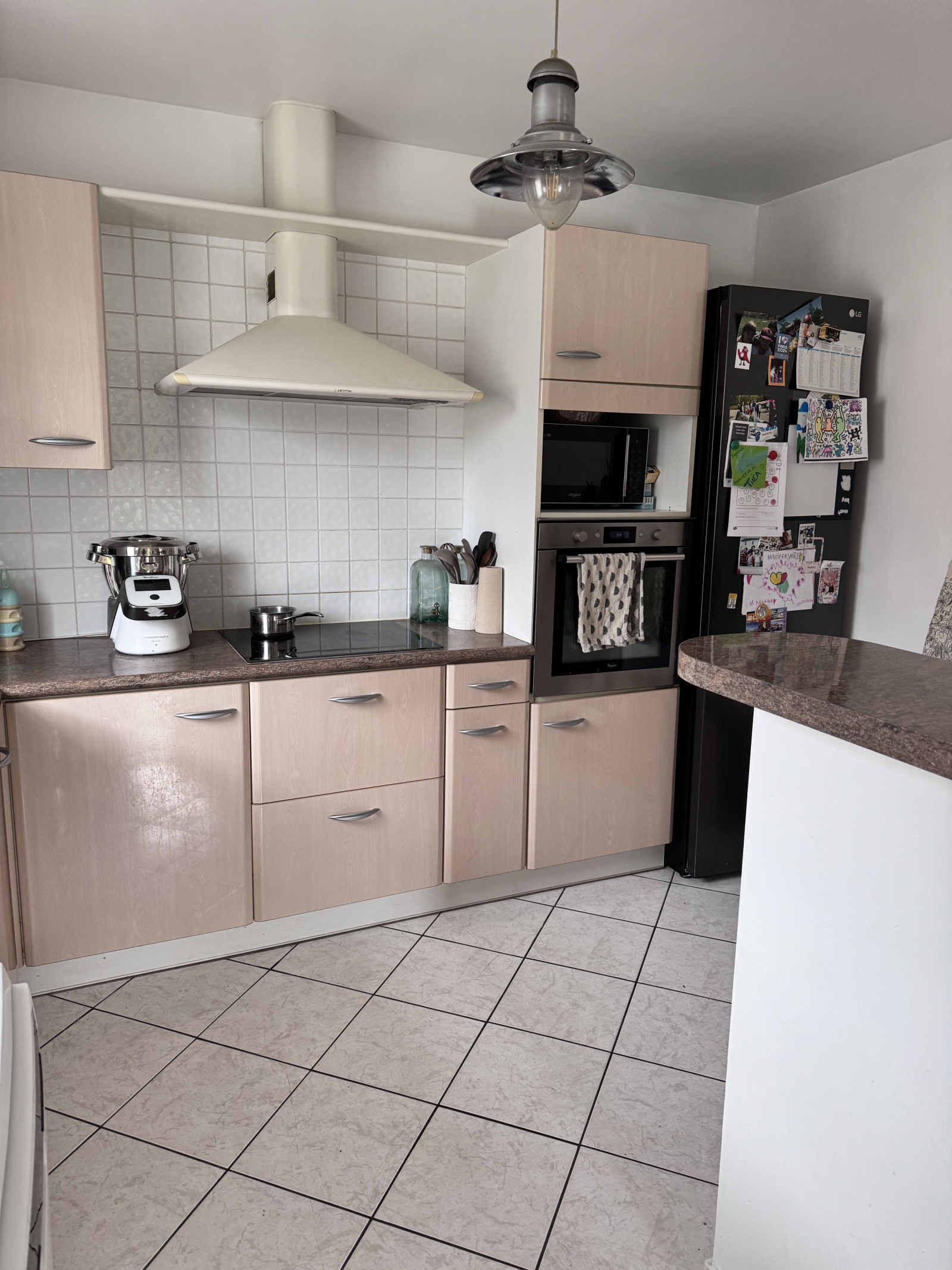 La cuisine, légèrement en retrait et délimitée par un bar, offre de beaux volumes de rangement.